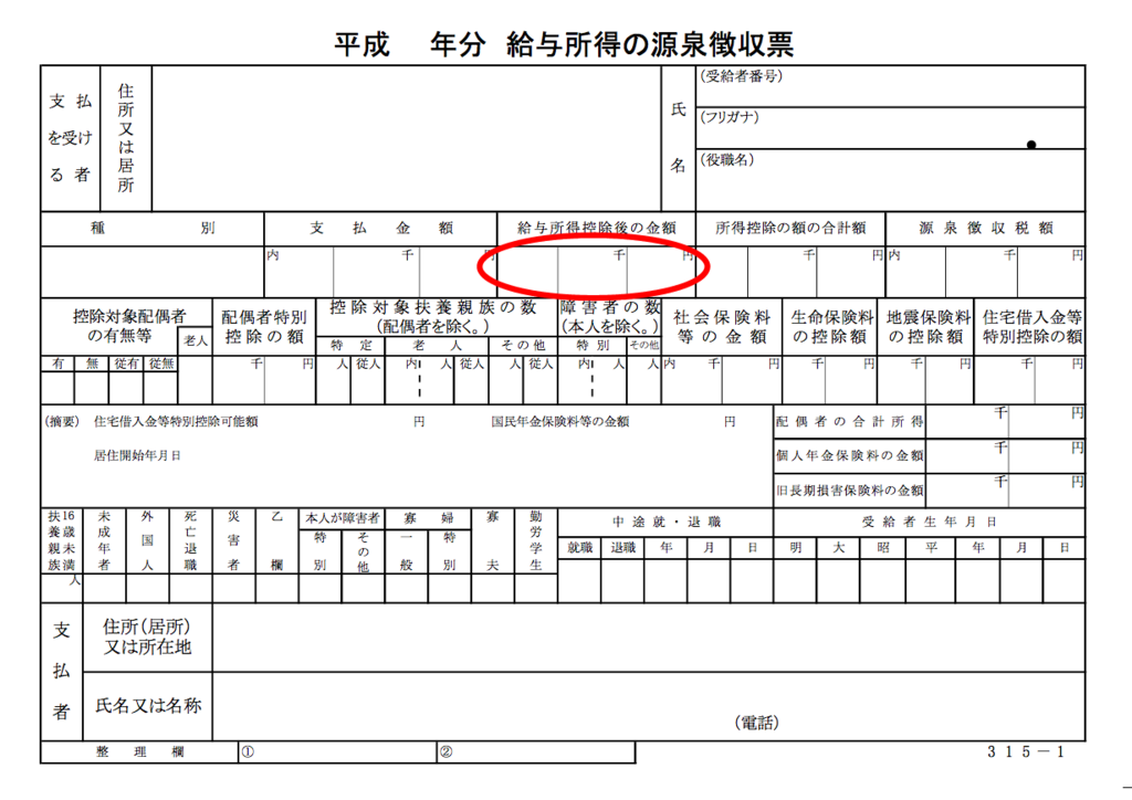 これは、収入が給与のみの方は、源泉徴収票の以下の「給与所得控除後の金額」部分を転記すれば良いです。